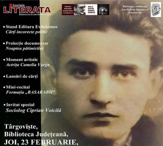 Asociaţia Literata, în colaborare cu Fundaţia „Profesor George Manu” şi Biblioteca Judeţeană Ion Heliade Rădulescu” organizează în data de joi, 23 februarie 2017, începând cu ora 17.00, la sediul Bibliotecii judeţene din Târgovişte (Str. Stelea, Nr. 2), conferinţa cu titlul „Valeriu Gafencu – Sfântul închisorilor”.