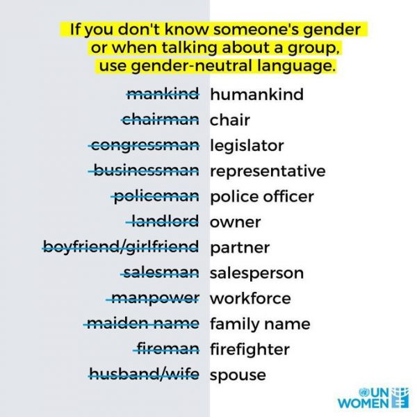 „Ceea ce spui tu contează. Ajutați-vă să creați o lume mai egală folosind un limbaj neutru în funcție de gen, dacă nu sunteți sigur cu privire la genul cuiva sau vă referiți la un grup ”, afirmă tweet-ul cu pricina. Apoi enumeră o serie de termeni alături alternativa lor corectă din punct de vedere politic. Lista include: omenirea, președintele, congresmanul, polițistul, proprietarul, vânzător, iubitul / iubita, om de afaceri, numele fetei, pompierul, soțul / soția etc