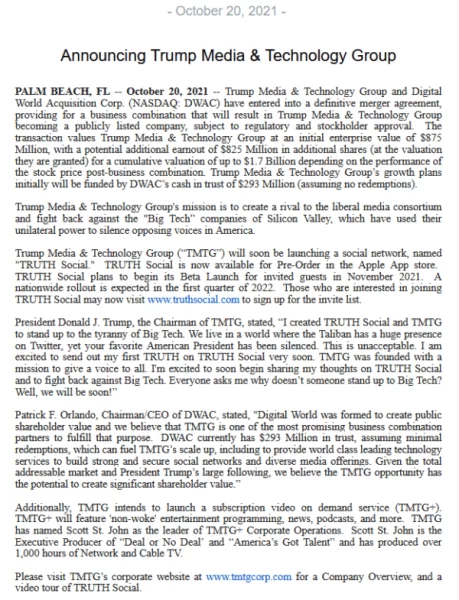 Trump Media & Technology Group („TMTG”) va lansa în curând o rețea socială, denumită „TRUTH Social”. TRUTH Social este acum disponibilă pentru precomandă în magazinul Apple App Store. TRUTH Social intenționează să înceapă lansarea Beta pentru invitați în noiembrie 2021. O lansare la nivel național este așteptată în primul trimestru al anului 2022. Cei care sunt interesați să se alăture TRUTH Social pot vizita acum www.truthsocial.com pentru a se înscrie pe lista de invitați.