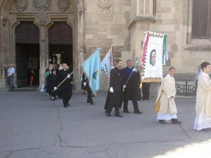 Steagul unei organizații întemeiate de fostul dictator fascist al Ungariei, Miklos Horthy, a fost sfințit ieri dimineață, în cadrul unei ceremonii religioase, oficiată în biserica romano-catolică Sfântul Mihail. La finalul ceremoniei, participanții au intonat imnul Ungariei.