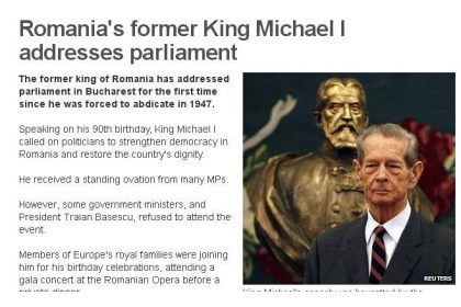 Discursul fostului rege al Romaniei evidentiaza o „dezbinare istorica”, apreciaza REUTERS, care-l citeaza pe Basescu afirmand ca Mihai I a fost „sclavul Rusiei” si noteaza absenta sa la sedinta Parlamentului, la care au luat parte, totusi, numerosi deputati din PDL. La inceputul anilor ’90, fostul suveran a lansat mai multe apeluri la restaurarea monarhiei, acesta avand in continuare numerosi sustinatori. Cateva mii de persoane i-au urat la multi ani pe site-ul familiei regale, iar unii au participat la un miting in fata Parlamentului, adauga agentia.