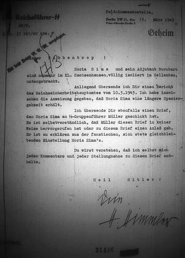 Heinrich Himmler îi scria personal lui Joachim von Ribbentrop pe 15 martie 1943 pentru a-i aduce la cunoştinţă îndeplinirea ordinelor lui Hitler şi a preciza că a dat ordin ca Horia Sima să aibă parte de un timp mai lung de plimbare – în condiţiile în care acesta era ţinut în izolare.
