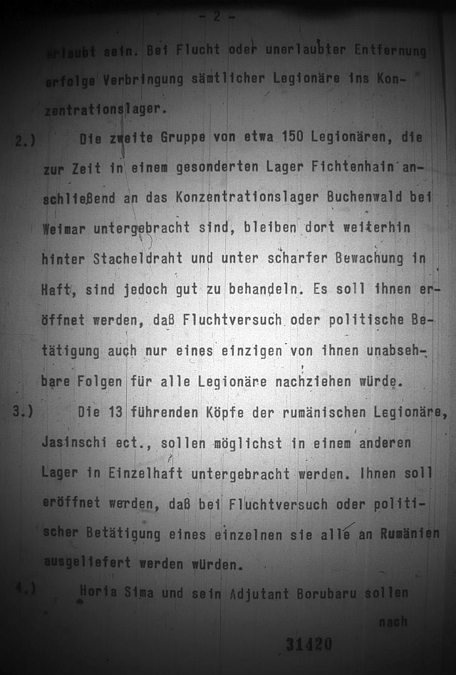 2. Ce-a de-a doua grupă de aproximativ 150 de legionari care în prezent sunt internaţi în lagărul special Fichtenhain dependent de lagărul de concentrare Buchenwald rămân deţinuţi acolo în continuare, în spatele sârmei ghimpate şi sub pază severă, totuşi trebuie trataţi bine. Trebuie să li se aducă la cunoştinţă că încercarea de evadare sau activitatea politică fie şi din partea unuia singur dintre ei va avea urmări neprevăzute pentru toţi legionarii.