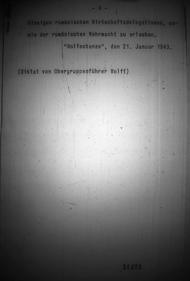 6. Domnul ministru de Externe al Reichului îl roagă prin intermediul Obergruppenfuhrer Wolff pe Reichsfuhrer SS (n.trad. – Heinrich Himmler) să emită un ordin către autorităţile subordonate lui prin care să interzică legăturile dintre legionarii români internaţi în lagăre şi cetăţenii români care pot circula liber, iar acestora din urmă să li se interzică să fie legionari sau să facă parte din partide politice. Reichsfuhrer SS crede că trebuie permise relaţiile cu cetăţenii români de sex masculin şi feminin (anume soţiile şi fiicele lor), ca şi cu delegaţiile economice şi militarii români.