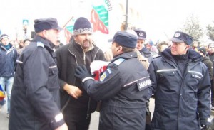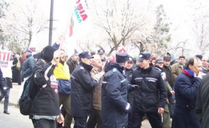 Jandarmii au fost nevoiţi să-i oprească pentru a-i ţine departe pe protestatari. În agitaţia creată două maşini din delegaţia oficială a premierului s-au lovit uşor la plecarea din zona Casei de Cultură a Sinicatelor.