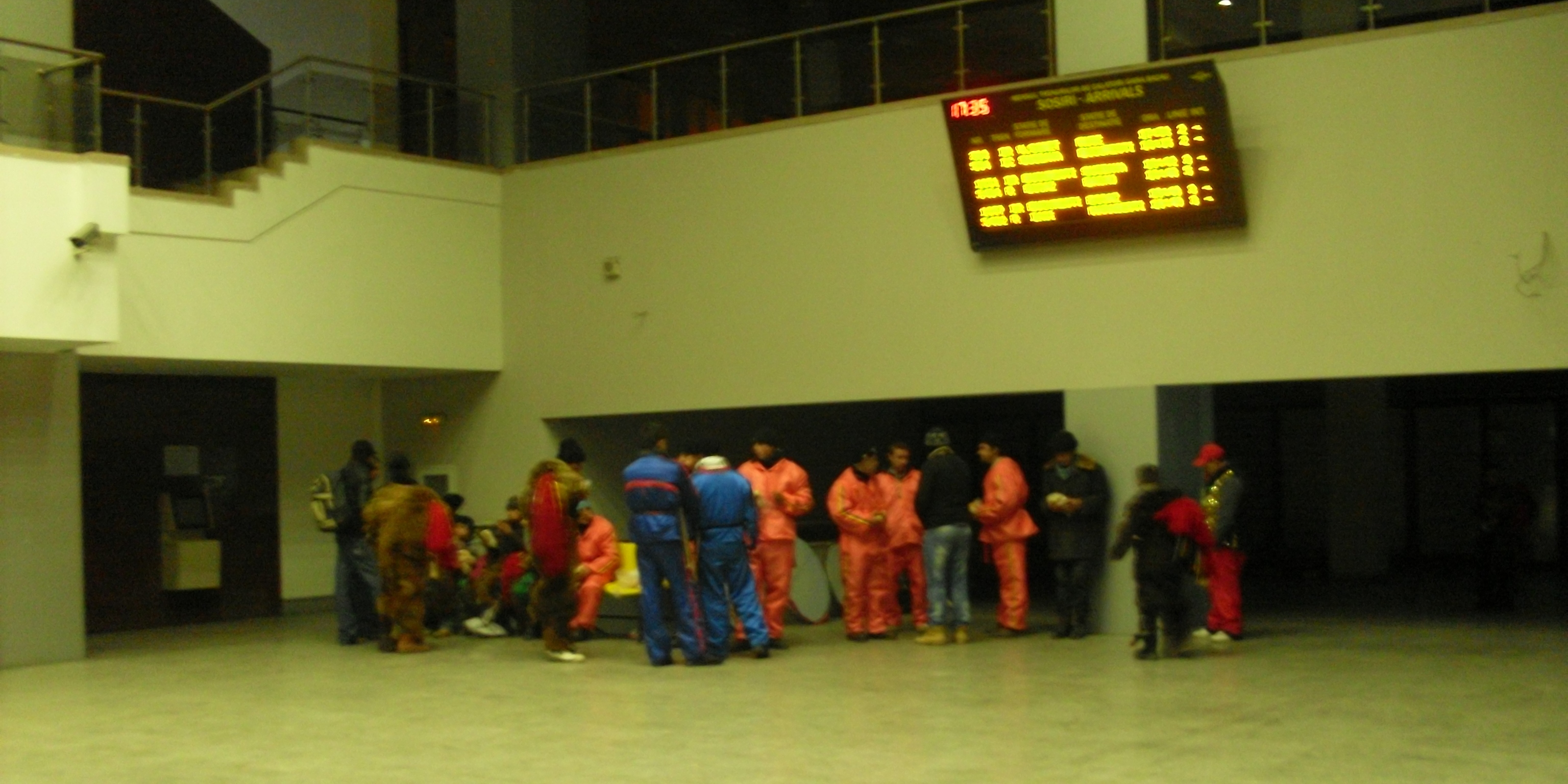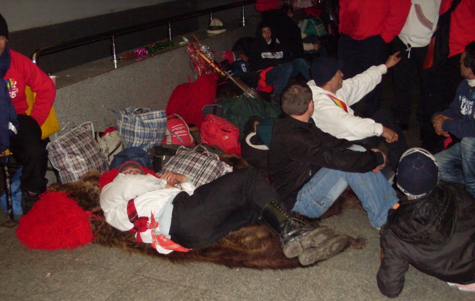Băieţi şi fete, copii, bărbaţi mai în vârstă, români şi ţigani, unii în costume roşii, alţii cu câte o bundiţă de Bacău mai autentică, alţii costumaţi în Irozi, stăteau lungiţi pe pardoseala rece sau mişunau iute prin gară, în aşteptarea unui tren. Care tren, n-am putut afla… Am aflat însă că veneau de la Constanţa. Fuseseră acolo pentru că la Bucureşti sunt prea multe cete. Un ţigănuş cu bondă băcăună, umblat prin lume, ţine să precizeze că au avut cazare la vilă, cu 100 de euro… Un bărbat cam de vreo 50 de ani, văzând un tânăr patetic entuziasmat de prezenţa lor, mărturiseşte: „Noi nu suntem aşa avuţi… umblăm şi noi să facem un ban…“. „Unii ne consideră cerşetori, huligani… Dar noi nu obligăm pe nimeni: cine vrea să ne dea, ne dă, cine nu, nu…“