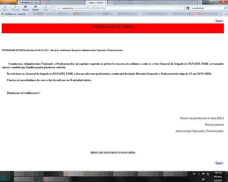 Reactia sindicatului vine dupa ce ANP a publicat vineri, 6 ianuarie, o informare de presa prin care anunta moartea generalului de brigada (r) Emil Panaite, fost director al Directiei Generale a Penitenciarelor intre anii 1976-1989. In informare s-a transmis condoleante familiei si s-au facut aprecieri fata de activitatea generalului (r) Panaite