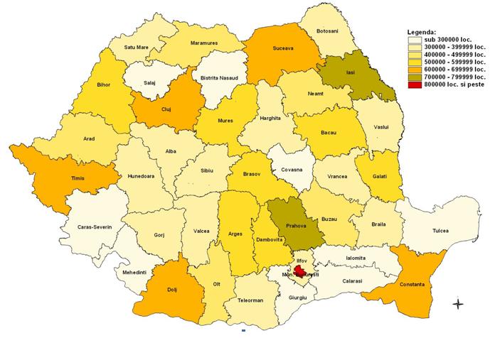 Cel mai mic numar de populatie il au judetele Tulcea (201.500), Covasna (206.300), Salaj (217.900), Mehedinti (254.600), Ialomita (258,7 mii), Giurgiu (265.500), Caras-Severin (274.300) si Bistrita-Nasaud (277.900).