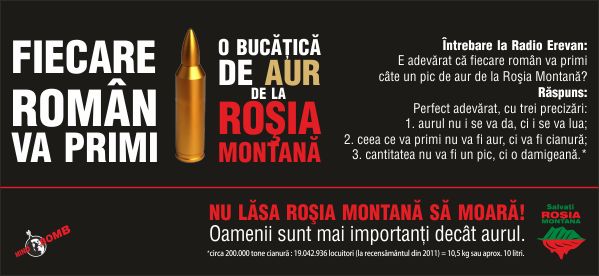 Publicitatea manipulatoare în favoarea proiectului de minerit Roşia Montană este demascată încă o dată de o nouă acţiune a grupului Mindbomb, Minciuna de Aur Ucide. Campania Salvaţi Roşia Montană salută iniţiativa Mindbomb prin care in noaptea din 11 spre 12 aprilie 2012 , grupul format din artişti, arhitecţi, jurnalişti şi scriitori a demarat o amplă acţiune de afişaj stradal în 43 de localităţi din România, lansând mesajul satiric „Fiecare român va primi o bucăţică de aur de la Roşia Montană” însoţit de imaginea apăsătoare a unui glonţ aurit de Kalashnikov.