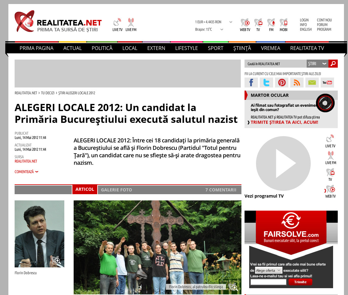 În ziua de marţi 15.05.2012, portalul on-line al publicaţiei Cotidianul, a publicat articolul „Un candidat la Primăria Bucureştiului execută salutul nazist” (http://www.cotidianul.ro/un-candidat-la-primaria-capitalei-saluta-in-stil-nazist-182615/), avînd ca autor pe ziarista Ioana Radu, articol conceput într-un mod neprofesionist şi cu o stridentă nuanţă de senzaţional.