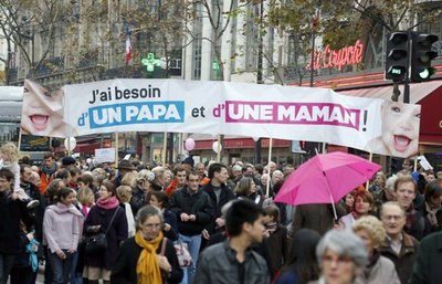 People hold a banner reading „I need a dad and a mom” as they take part in a demonstration to denounce the same-sex marriage on November 17, 2012 in Paris. France’s Socialist government on November 7, 2012 adopted a draft law to authorise gay marriage and adoption despite fierce opposition from the Roman Catholic Church and the right-wing opposition. AFP PHOTO PIERRE VERDY
