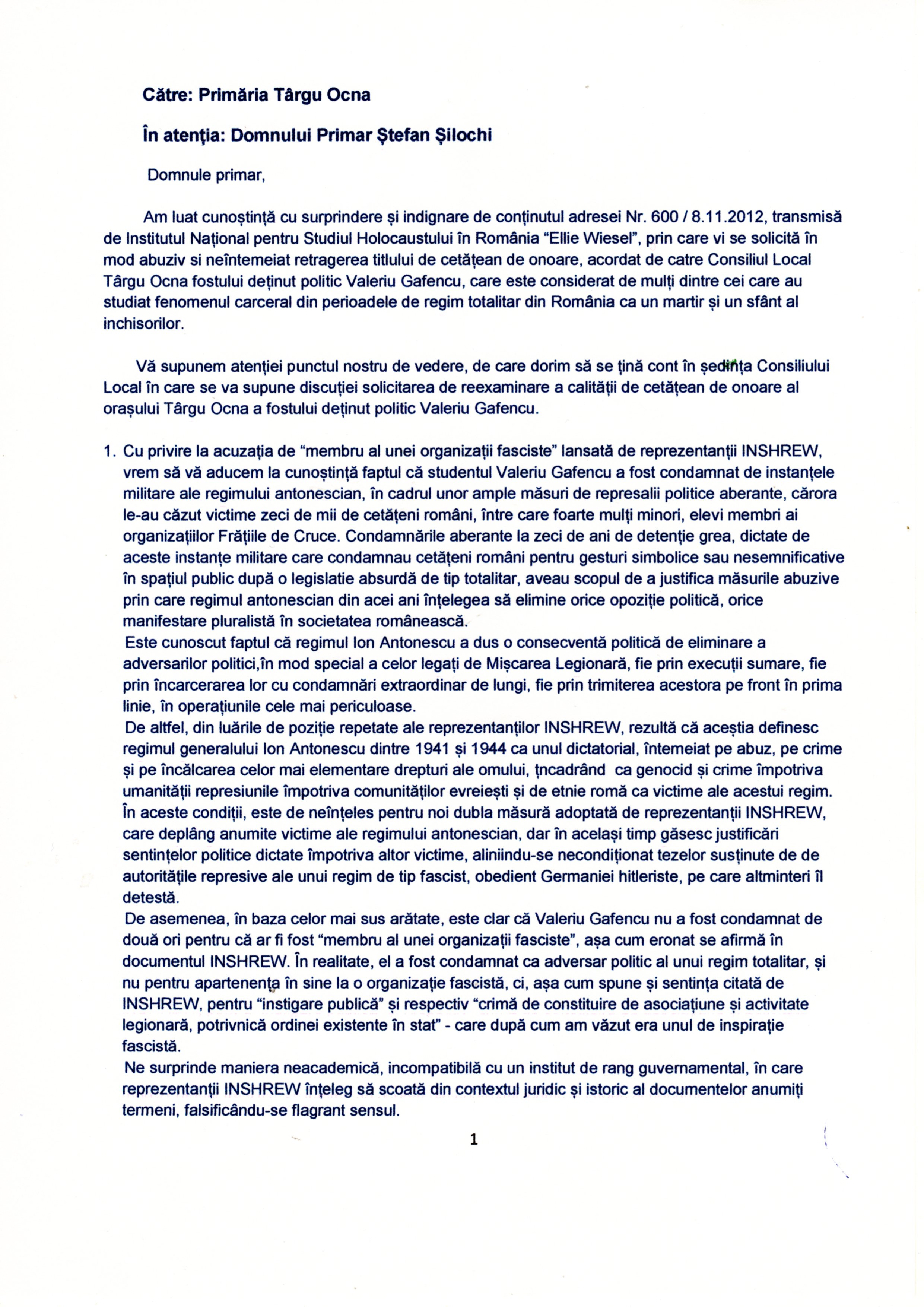 Return to "SOLIDARITATE PENTRU VALERIU GAFENCU! Societatea civilă şi oamenii de cultură se mobilizează pentru…" tg ocna memoriu pag 1 Next Previous