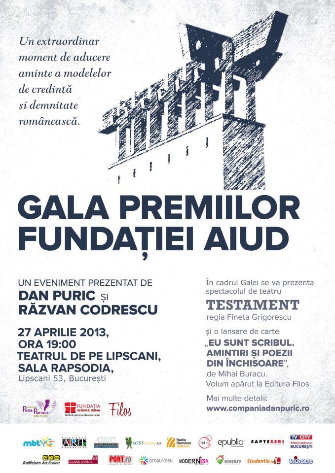 Sâmbătă, 27 aprilie, orele 19:00, la Teatrul de pe Lipscani, vor fi decernate Premiile Fundatiei Aiud în cadrul unui eveniment de excepție prezentat de Dan Puric și Răzvan Codrescu.