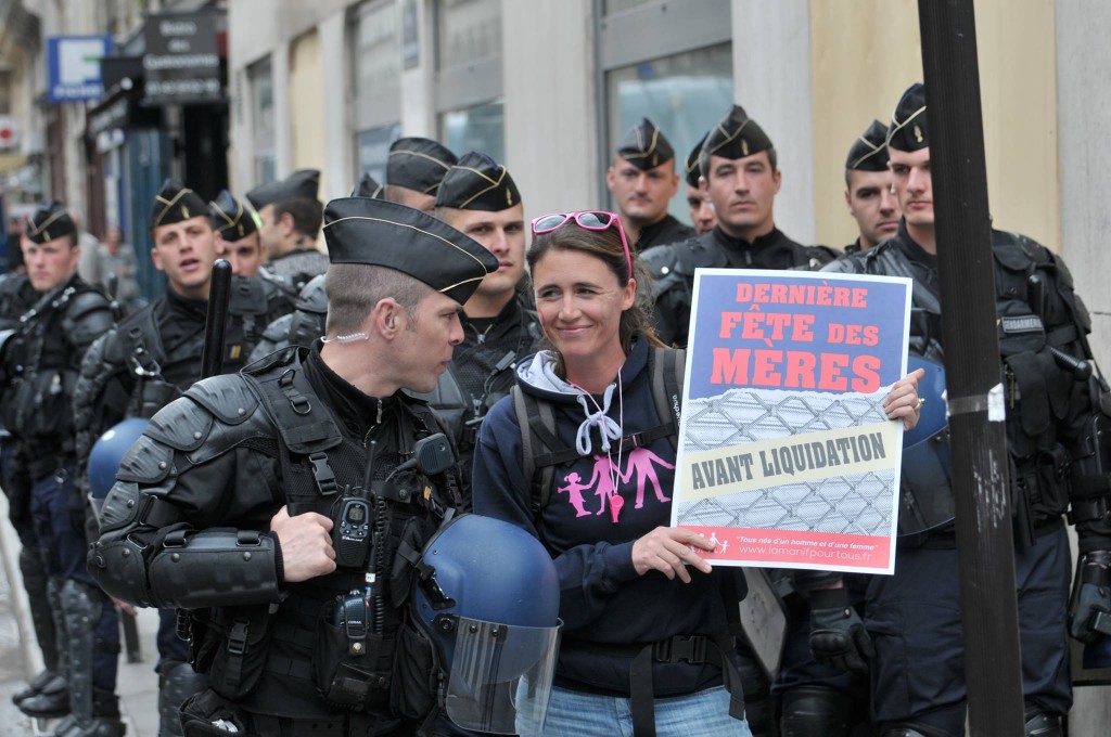 O pariziancă participantă la o manifestație de protest arată unui jandarm un afiș pe care scrie „Ultima sărbătoare a mamelor, înainte de lichidare”. Aluzie la dispariția din Codul civil a termenilor „mamă” și „tată” ca urmare a legiferării „căsătoriei” între persoane de același sex și a adopției de copii de către homosexuali