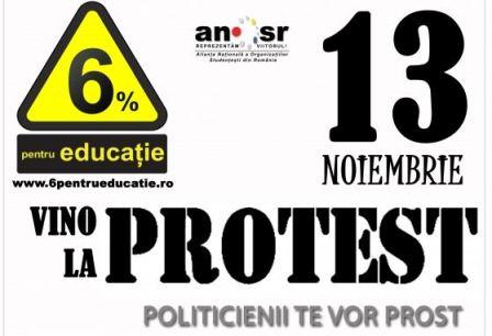 Studenții din centrul Universitar Iași cheamă colegii la protest, miercuri, 13 noiembrie, pentru a cere Guvernului României alocarea a 6% din PIB pentru educație, începând cu 2014, se arată într-un comunicat trimis la redacție.