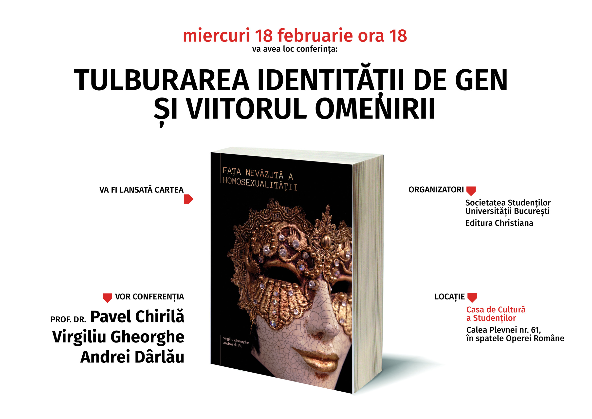 Societatea Studentilor Universitatii Bucuresti (SSUB) si Editura Christiana va invita la conferinta “Tulburarea identitatii de gen si viitorul omenirii” in cadrul careia va avea loc si lansarea cărții lui Virgil Gheorghe – “Fața nevăzută a Homosexualității”, miercuri, la ora 18.00 in Sala de festivitati a Casei de Cultura a Studentilor. (et.2)