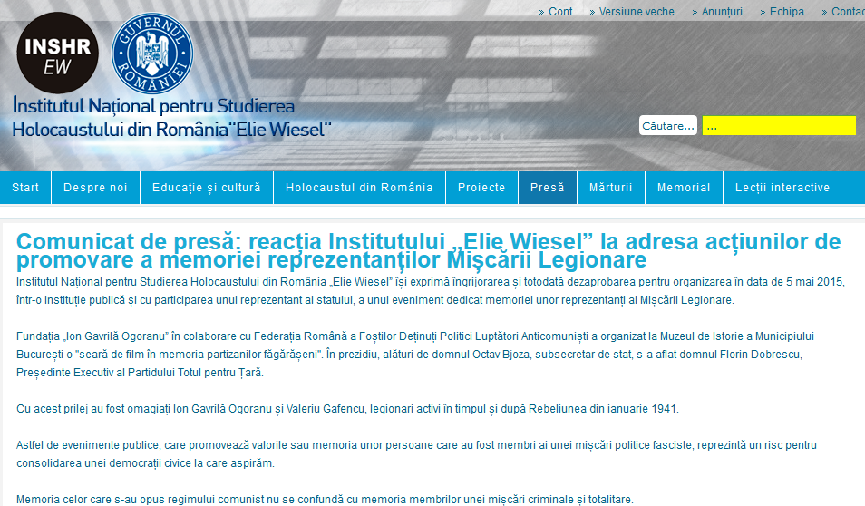 Astfel, Institutul a denunțat faptul că omagierea Ion Gavrilă Ogoranu și Valeriu Gafencu, ”legionari activi în timpul și după Rebeliunea din ianuarie 1941”, a avut loc într-o instituției publică.