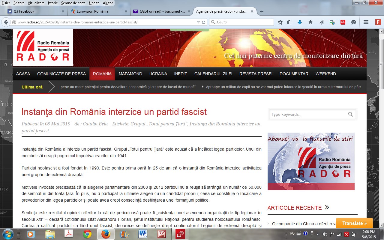 In cadrul articolului „Instanta din Romania interzice un partid fascist”, publicat in 8 mai 2015 de Catalin Belu, este preluata o informatie din ziarul DIE TAGESZEITUNG (Germania), din ziua 6 mai 2015, purtand semnatura lui William Totok.