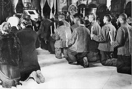 Deţinuţi de drept comun asistând la slujba Învierii în bbiserica penitenticarului Văcăreşti. Perioada interbelică.