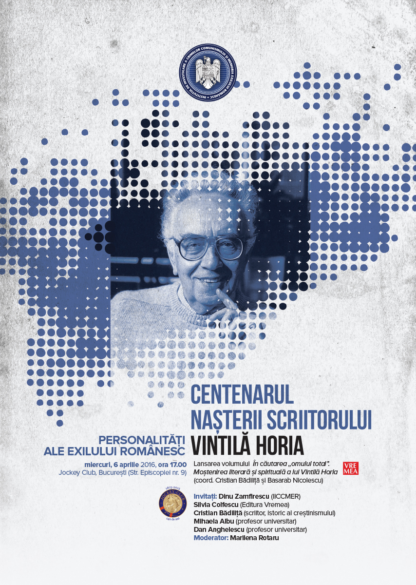 Institutul de Investigare a Crimelor Comunismului şi Memoria Exilului Românesc (IICCMER) vă invită miercuri 6 aprilie, ora 17.00, la Jockey Club din Bucureşti (Str. Episcopiei nr. 9), la Centenarul nașterii scriitorului Vintilă Horia, singurul autor român care a fost distins, în noiembrie 1960, cu prestigiosul premiu Goncourt pentru romanul Dieu est né en exil.