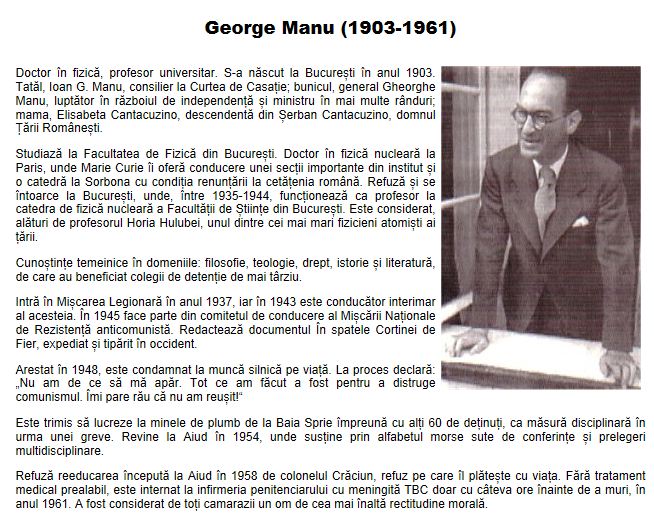 Apoi am aflat şi eu ce ştia toată lumea: lupta, arestarea, tortura şi, în particular, acuzarea şi condamnarea pe viaţă a lui Gheorghe Manu în procesul Sumanelor Negre, şi comportarea sa demnă în temniţă până la moarte. Dar adevăratul său merit şi renume, dincolo de orice apartenenţă partinică sau ideologică, rămâne crearea, prin jertfa de sine, a acelei unice Universităţi din Aiud, care avea trei facultăţi: una de dragoste de neam, de omenie şi de bărbăţie; una de dragoste de cinste și demnitate şi una de dragoste de cunoaştere şi cultură, în frunte cu Rectorul Magnificus Gheorghe Manu.