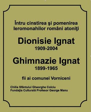 Fundația „Profesor George Manu” vă invită să luați parte la sfințirea Troiței ridicată întru cinstirea ieromonahului Dionisie Ignat (1909-2004), stareț al chiliei românesti Sfântul Gheorghe Colciu de la Muntele Athos. Alături de părintele Dionisie va fi pomenit și fratele sfinției sale, ieromonahul Ghimnazie Ignat (1899-1965).