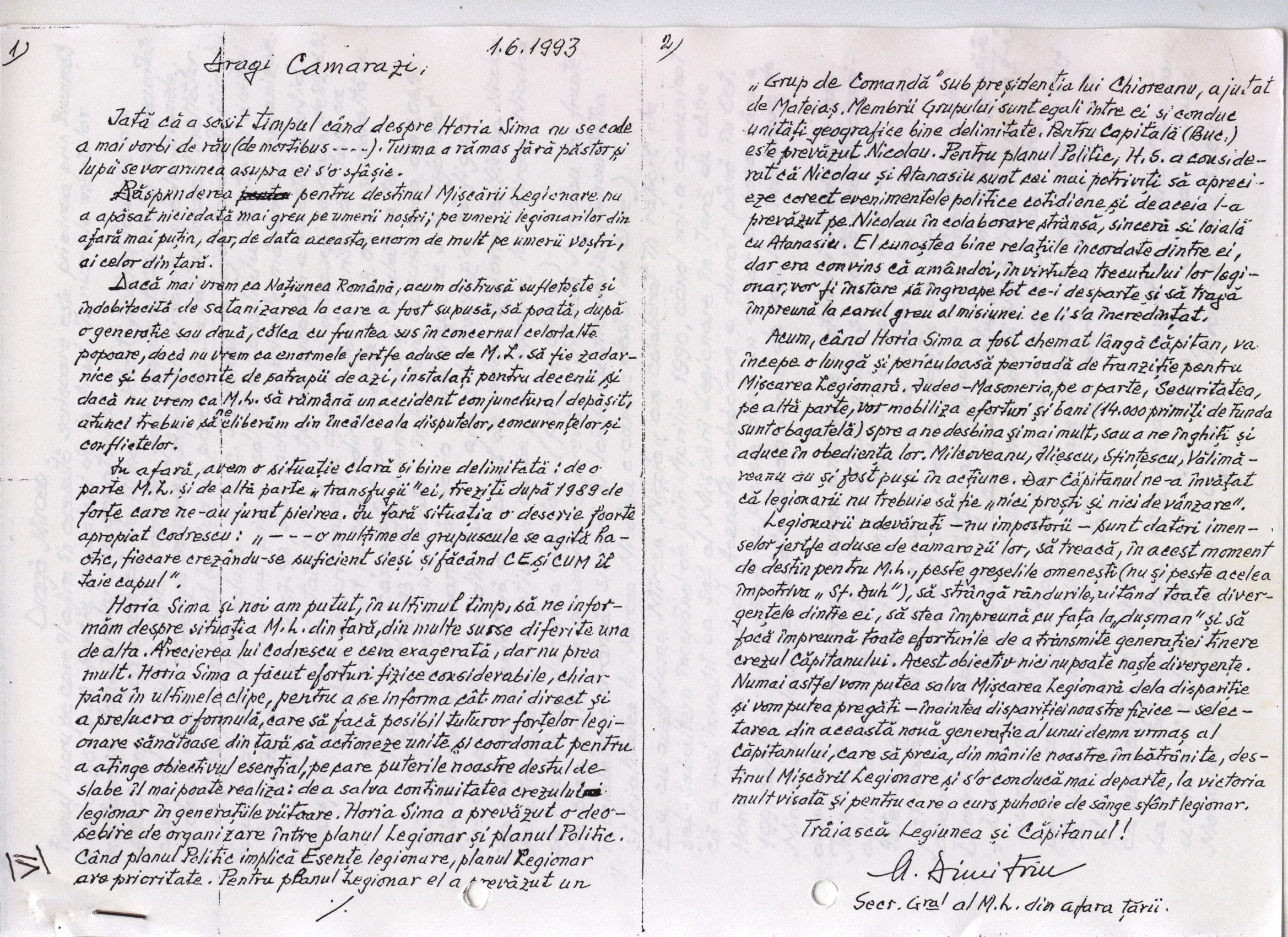 Return to "O CORESPONDENŢĂ LEGIONARĂ INEDITĂ. Întrunirea de la Budapesta. Cum s-au reorganizat legionarii sub…" Scrisoare catre camarazi M.Dimitriu 1993 Next Previous