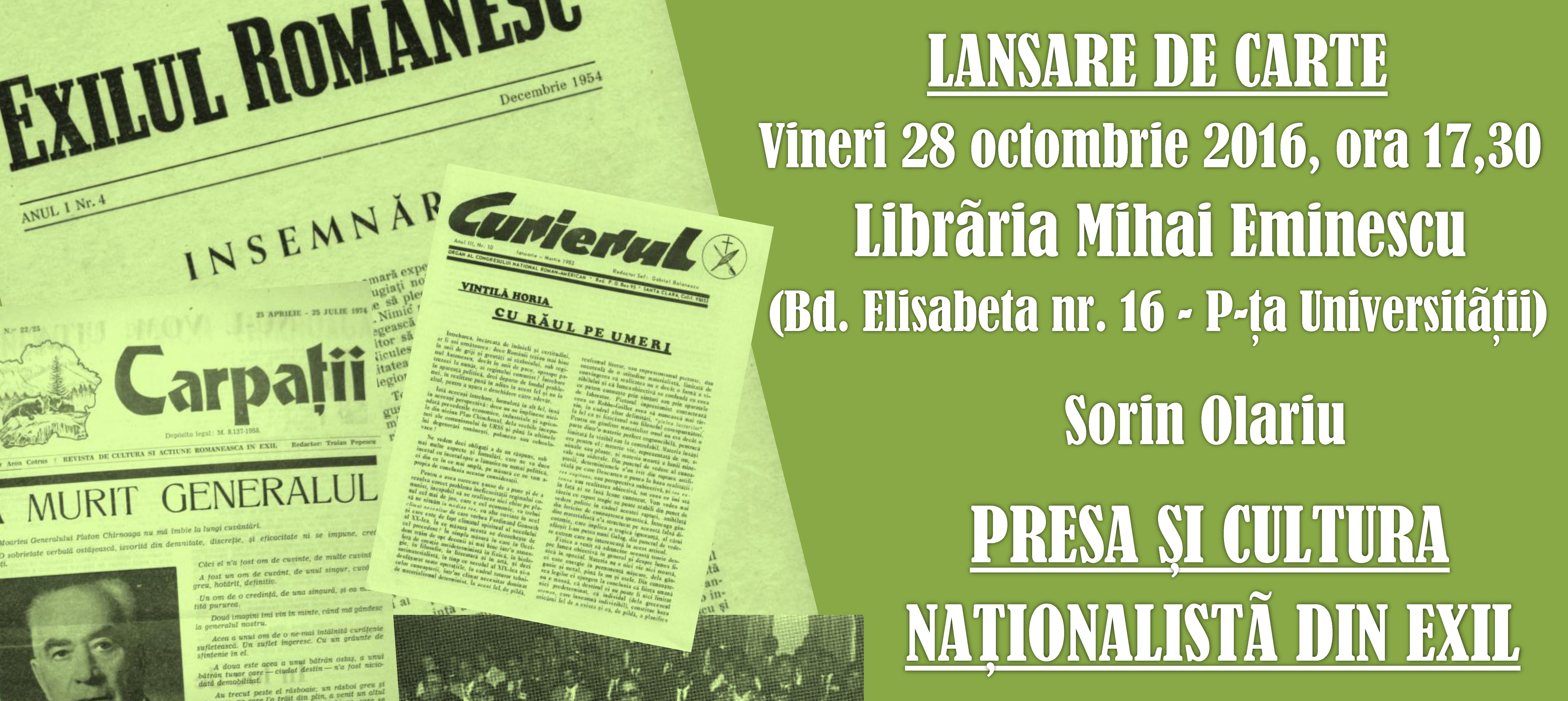 Lansarea unei inedite lucrări dedicate exilului anticomunist: Sorin Olariu – PRESA SI CULTURA NATIONALISTÃ DIN EXIL – Vineri 28 oct. 2016, ora 17,30, la Librăria Eminescu din Bucureşti (Piaţa Universităţii, Bd. Elisabeta 16)