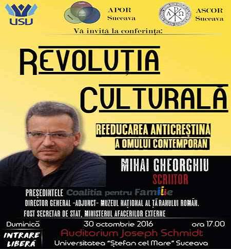 Pe 30 octombrie 2016, Mihai Gheorghiu, președinte al COALIȚIEI PENTRU FAMILIE și director adjunct al Muzeului Țăranului Român, va susține la Suceava conferința „Revoluția Culturală – Reeducarea anticrestină a omului contemporan”.