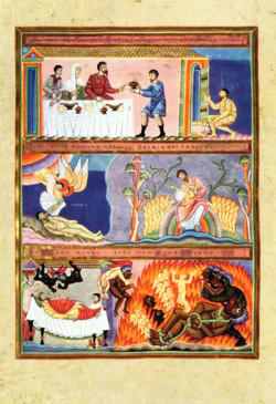 Zis-a Domnul: Era un om bogat care se îmbrăca în porfiră şi în vison, veselindu-se în toate zilele în chip strălucit. Iar un sărac, anume Lazăr, zăcea înaintea porţii lui, plin de bube, poftind să se sature din cele ce cădeau de la masa bogatului; dar şi câinii, venind, lingeau bubele lui. Şi a murit săracul şi a fost dus de către îngeri în sânul lui Avraam. A murit şi bogatul şi a fost înmormântat. Şi, în iad, ridicându-şi ochii, fiind în chinuri, el a văzut de departe pe Avraam şi pe Lazăr în sânul lui. Şi el, strigând, a zis: Părinte Avraam, fie-ţi milă de mine şi trimite pe Lazăr să-şi ude vârful degetului în apă şi să-mi răcorească limba, căci mă chinuiesc în această văpaie! Dar Avraam a zis: Fiule, adu-ţi aminte că tu ai primit cele bune ale tale în viaţa ta, şi Lazăr, asemenea, pe cele rele; şi acum aici el se mângâie, iar tu te chinuieşti. Şi, peste toate acestea, între noi şi voi s-a întărit prăpastie mare, ca aceia care voiesc să treacă de aici la voi să nu poată nici cei de acolo să treacă la noi. Iar el a zis: Rogu-te, dar, părinte, să-l trimiţi în casa tatălui meu, căci am cinci fraţi, să le spună lor acestea, ca să nu vină şi ei în acest loc de chin. Şi i-a zis Avraam: Au pe Moise şi pe prooroci; să asculte de ei. Iar el a zis: Nu, părinte Avraame, ci, dacă cineva dintre morţi se va duce la ei, se vor pocăi. Şi i-a zis Avraam: Dacă nu ascultă de Moise şi de prooroci, nu vor crede nici dacă ar învia cineva din morţi. (Luca XVI, 19-31)
