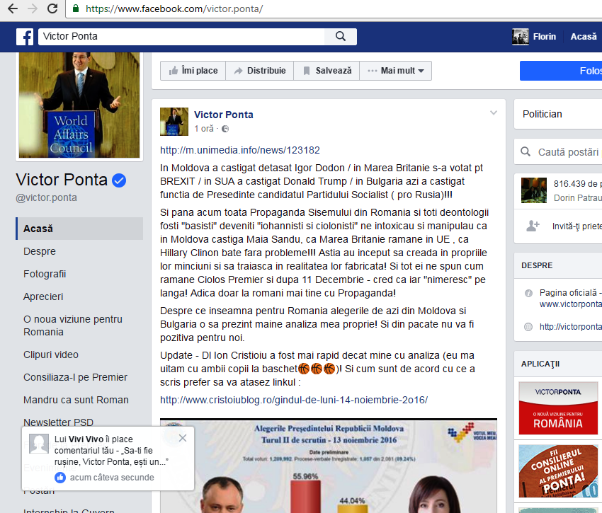 El nu se fereşte să-şi arate satisfacţia pentru victoria omului lui Putin – kolhoznicul Dodon. Mai mult, îşi exprimă satisfacţia pentru victoria, în Bulgaria, a partidei „proruse” (chiar aşa spune imberbul pesedist)! Şi aşează cele două dezastre, de la răsărit şi de la sud de România, pe o axă logică cu Brexit şi… victoria lui Trump în America!!!
