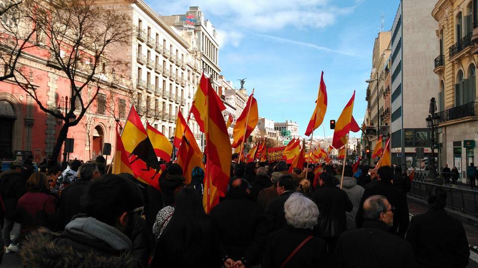 MADRID. Manifestaţie în apărarea naţionaliştilor inculpaţi pentru atacul împotriva separatiştilor catalani. Justiţia spaniolă persecută pe naţionalişti şi apără pe secesionişti.