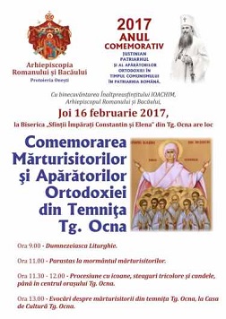 Joi, 16 februarie a.c., la Biserica „Sfinții Împărați Constantin și Elena” din orașul Târgu Ocna va avea loc, cu binecuvântarea IPS Părinte Ioachim, Arhiepiscopul Romanului și Bacăului, un eveniment deosebit sub egida Comemorării Mărturisitorilor și Apărătorilor Ortodoxiei din temnița de la Târgu Ocna.