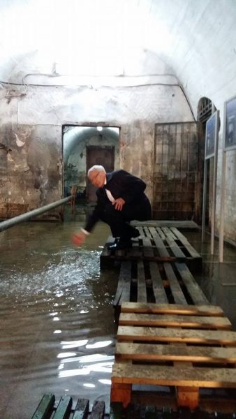 Era inceputul lunii martie cand Octav Bjoza, unul dintre detinutii politici care a suportat ororile petrecute in Fortul 13, filma un manifest nefiresc. Imbracat in costum si cocotat pe paleti, omul condamnat de comunisti la 15 ani de munca silnica incearca sa dea apa afara cu mana ca sa atraga atentia asupra degradarii fostei inchisori, chiar daca a fost declarata monument istoric de importanta nationala si universala.