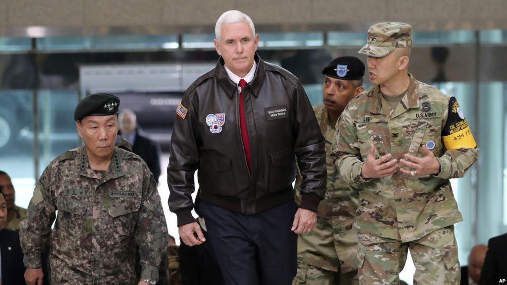 Pence a sosit cu elicopterul la baza militară Bonifas a ONU, aflată la câteva sute de metri de zona demilitarizată. El urma să se deplaseze apoi în satul Panmunjon, prin care trece frontiera inter-coreeană şi unde s-a semnat armistiţiul din Coreea în 1953.