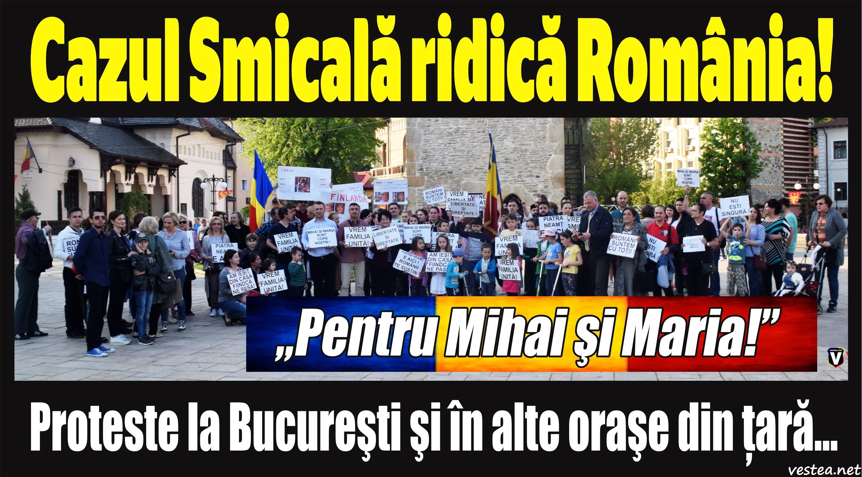 Duminică, 21 Mai, de Sfinţii Împăraţi Constantin şi Elena, începând cu ora 13.00, au loc în mai multe oraşe din ţară demonstraţii de solidaritate cu toate familiile de români vitregite de copii în mod barbar. În Bucureşti are loc o adunare publică pentru susţinerea dnei dr. Camelia Smicală în faţa autorităţilor române şi finlandeze. Manifestaţia de solidaritate cu dr. Camelia Smicală şi copiii dânsei, Mihai şi Maria, este autorizată şi incepe în faţa Ambasadei Finlandei din Bucureşti şi se încheie la MAE, unde se va înmâna un protest oficial. Participanţii sunt îndemnaţi, dacă pot, să vină în costume naţionale şi cu drapelul naţional tricolor. Cel mai important însă, este să vină! Cei doi copii au fost răpiţi de statul finlandez şi au fost abuzaţi psihic şi fizic într-un mod care aminteşte de practicile totalitare, antiumane, ale regimurilor naziste şi comuniste. De exact un an Maria, de 10 ani, şi Mihai, de 11 ani, sunt separaţi în case de plasament diferite. Nici Ambasada României în Finlanda nu are acces – nici măcar telefonic – la cei doi copii, cetăţeni români. Finlanda are obligaţia să respecte toate drepturile unor cetăţeni europeni! Alte demonstraţii au loc la Timişoara – Piaţa Operei, Cluj Napoca – Piaţa Avram Iancu, Braşov – Piaţa Sfatului, Iaşi – Prefectură, Constanţa – Prefectură.