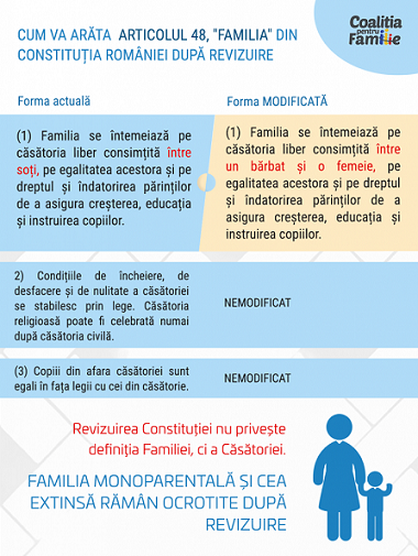 Nu este nevoie să fii jurist să observi că teza finală a art. 48 alin 1 din Constituție, respectiv aceea care trimite la familie ca raport juridic izvorât din calitatea de părinte, nu face obiectul revizuirii. La fel cum nu fac obiectul acestei revizuiri nici dispozițiile art. 48 alin. 3 din Constituție, respectiv acelea care consacră drepturile tuturor copiilor – indiferent dacă sunt crescuți de un singur părinte, de doi părinți necăsătoriți sau de orice altă rude având astfel de drepturi – ca fiind egale cu cele dintr-o familie compusă din mamă și tată și în egală măsurăocrotite. În mod similar și tot în interesul copiilor este consacrată legislativ și ocrotirea părintelui singular care crește și îngrijește copii.