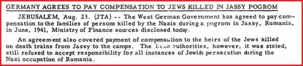 În traducere, ştirea de pe fluxul din ziua de 24 august 1959 al publicaţiei Jewish Telegraphic Agency spune următoarele: „IERUSALIM, Aug. 23 (JTA) – Guvernul Germaniei de Vest acceptă să plătească compensaţia către familiile şi persoanele ucise de Nazişti în timpul pogromului din Iaşi, România, în iunie, 1941, au dezvăluit astăzi surse ale Ministerului de Finanţe.