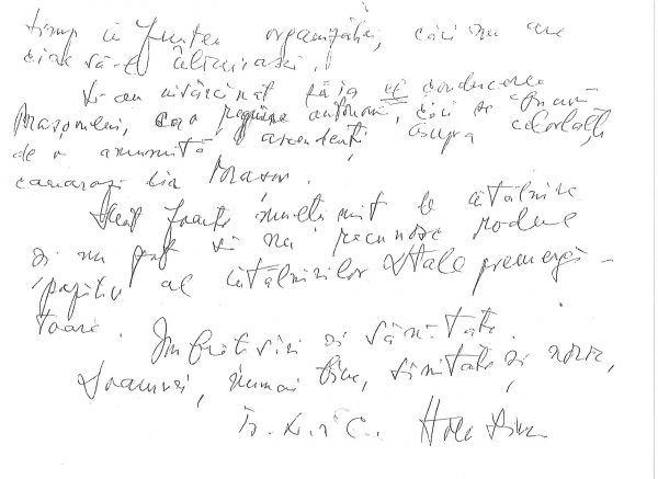 Este trist că, după moartea lui Horia Sima, unii din colaboratorii săi apropiaţi au făcut uitată această hotărâre a Comandantului Mişcării. Cu toţii ştiau, de bună seamă, care fusese decizia lui Horia Sima. Dovadă, faptul că, în plicul respectiv, scrisoarea este însoţită de o carte poştală adresată lui Halmaghi, pe care, alături de semnătura lui Horia Sima, se află semnăturile altor membri ai conducerii legionare din exil: Nae Roşca şi Dumitru Creţu.