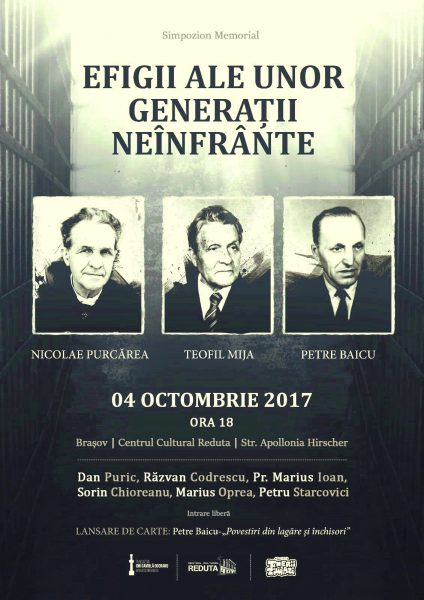 Nicolae Purcărea, Teofil Mija și Petre Baicu sunt trei exemple din această comunitate eroică și martirică a căror personalitate și operă o vom evoca împreună cu invitații nostri în cadrul simpozionului memorial de miercuri, 4 octombrie 2017, ora 18, la Centrul Cultural Reduta din Brașov.