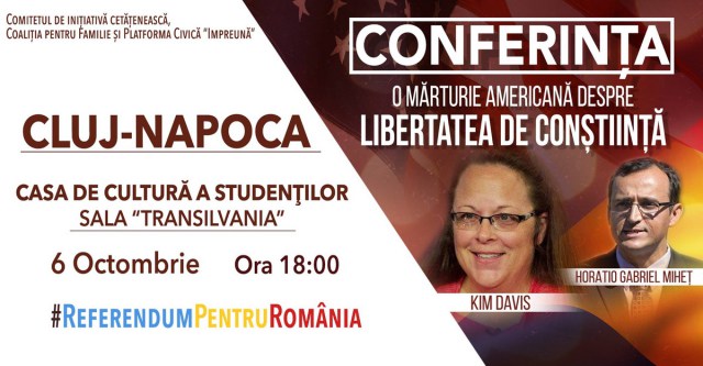 Comitetul de inițiativă cetățenească, Coaliția pentru Familie și Platforma Civică „Ȋmpreună” vă invită la conferinƫa „O mărturie americană despre libertatea de conștiință”, având ca invitaƫi din Statele Unite ale Americii pe Kim Davis şi Horațio Gabriel Miheț.