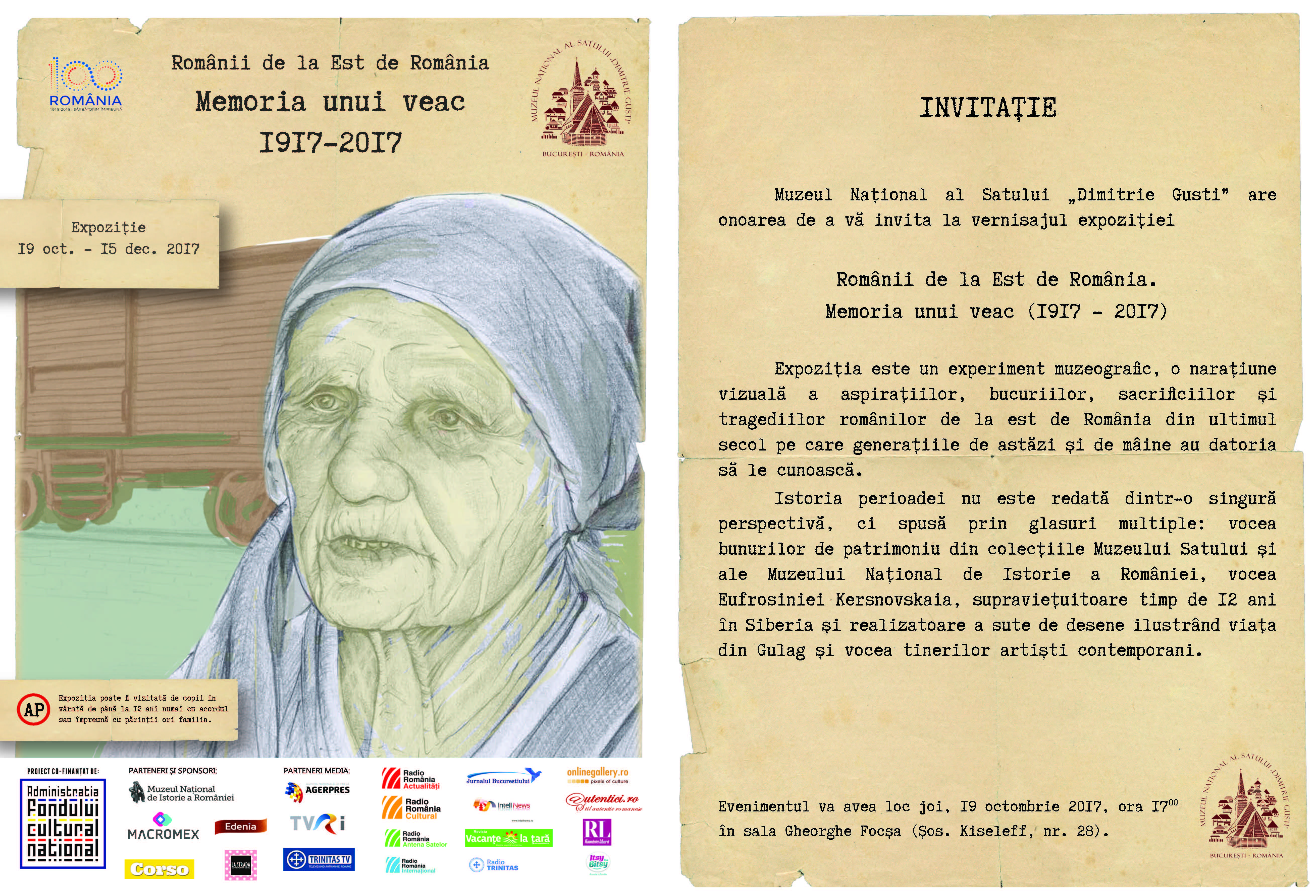 Joi, 19 octombrie 2017, ora 17.00, va avea loc vernisajul expoziției „Românii de la Est de România, anunţă Muzeul Naţional al Satului „Dimitrie Gusti”. Memoria unui veac (1917 – 2017)”, care este un experiment muzeografic, o narațiune vizuală a aspirațiilor, bucuriilor, sacrificiilor și tragediilor românilor de la est de România din ultimul secol, pe care generațiile de astăzi și de mâine au datoria să le cunoască.