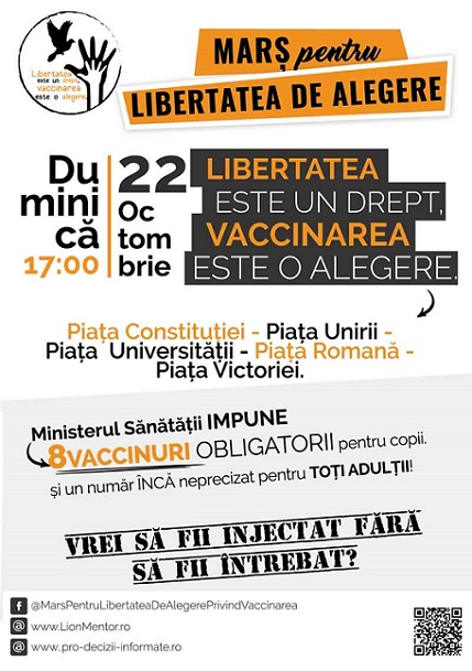 Asociatia Pro Decizii Informate, impreuna cu mai multe asociatii din Coalitia pentru Sanatate, va cheama duminica, 22 octombrie 2017, la marsuri si proteste organizate pentru a semnaliza autoritatilor ca NU SUNTEM DE ACORD cu introducerea vaccinarii obligatorii!