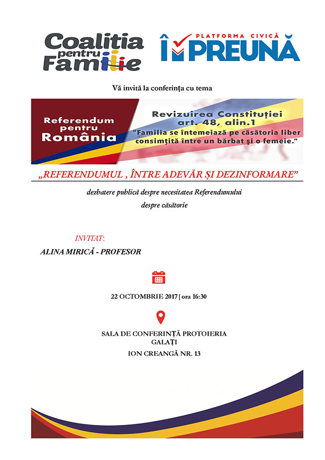 Dragilor, vă invităm în primul rând pe dumneavoastră ca susţinători ai Platformei Împreună, şi pe cei pe care puteţi să-i aduceţi, la conferinţa „Referendumul, între adevăr şi dezinformare”. Invitata este doamna profesoară Alina Mirica din Focşani, unul dintre cei 5 purtători de cuvânt din ţară autorizaţi de către Coaliţia pentru Familie, un om de o mare calitate sufletească, mama a 6 copii cu care colaborăm foarte bine şi la Scoala Familiei în Galaţi.