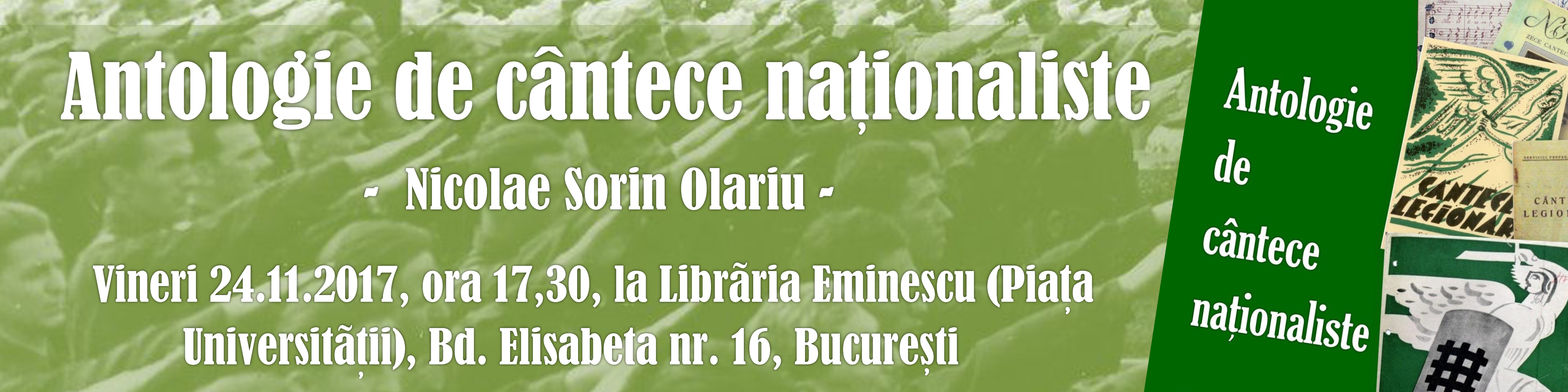 Lansarea cărţii „ANTOLOGIE DE CÂNTECE NAŢIONALISTE” de Sorin Olariu, o amplă culegere de creaţii muzicale aparţinând patrimoniului istoric al Mişcării Legionare, dar şi din perioada premergătoare acesteia, precum şi din timpul Rezistenţei şi din închisorile comuniste, terminând cu creaţii ale exilului, va fi lansată Vineri 24 noiembrie 2017, ora 17,30, la Librăria Mihai Eminescu, Bd. Elisabeta nr. 16 (Pţa Universităţii).