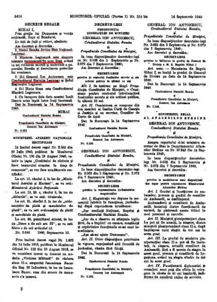 14 septembrie 1940: prin Decret Regal, România devenea Stat Național Legionar
