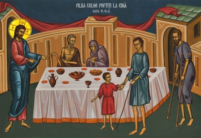 Era o zi de sâmbătă – sărbătoare a Vechiului Testament. Domnul tocmai vindecase un bolnav. Unul dintre fruntașii fariseilor îl roagă să ia cina în casa lui. Mântuitorul răspunde chemării și, luând seama cum ceilalți invitați își alegeau locurile, foloșeste prilejul și-i povățuiește: “Când ești chemat împreună cu alții la vreun ospăț, nu te așeza în locul cel dintâi, ca nu cumva să fie chemat altul mai de cinste decât tine. Și venind cel care te-a chemat pe tine și pe el, îți va zice: Dă acestuia locul. Atunci, cu rușine, te vei duce să te așezi pe locul cel mai de pe urmă… Tu așază-te în cel din urmă loc. Și văzându-te cel ce te-a chemat, să-ți zică: Prietene, mută-te mai sus“ (Luca 14, 7-9). Cu grijă, Domnul previne și ferește de calea dureroasă care te dă în jos, te prăvale. Dar de jos nu ai unde să cazi; în schimb, ai unde să urci – cu duhul. Și Domnul continuă: “Când faci prânz sau cină, nu chema pe prietenii tăi, nici pe frații tăi, nici vecinii bogați (…).