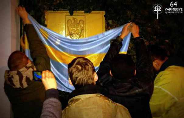 Huliganii au acoperit stema aflată pe Ambasada României de la Budapesta cu un steag al Ţinutului Secuiesc.
