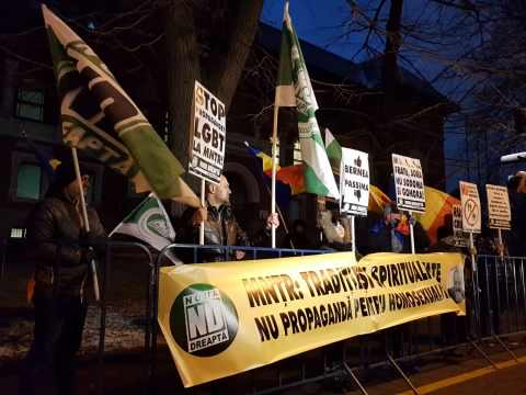 Tudor Ionescu, liderul Noua Dreaptă, a ținut un discurs în care a atacat conducerea muzeului: „Este a treia provocare într-o singură lună, al treilea film cu tematică homosexuală la Muzeul Țăranului Român. Conducerea interimară a muzeului e implicată în această provocare – o doamnă pe nume Liliana Passima – care e direct vinovată de programarea unor astfel de filme aici”, informează News.ro.