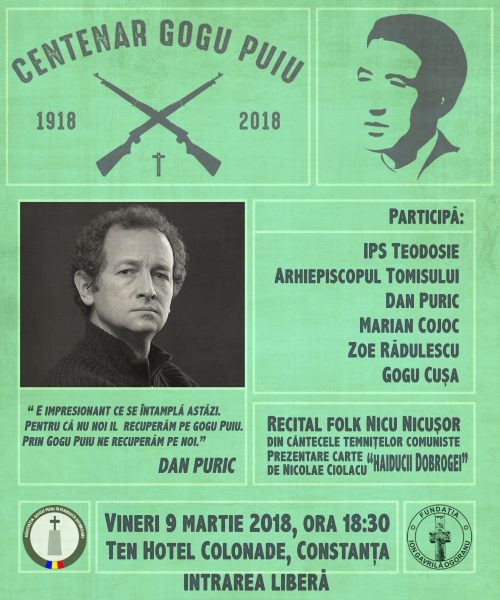Vă invităm la evenimentul memorial – GOGU PUIU 100 – unde veți avea ocazia să ascultați evocări ale celor care au ales să nu plece capul în fața jugului bolșevic.